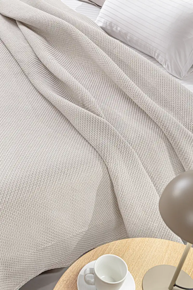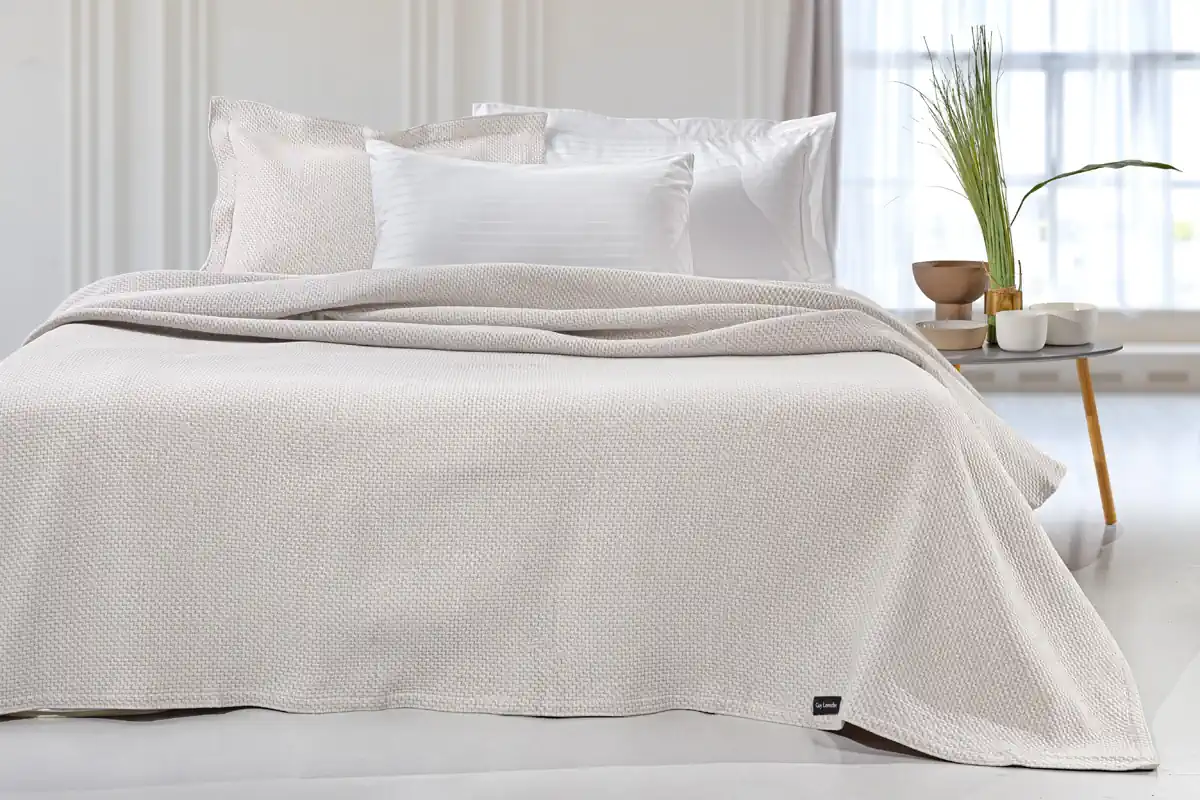 Ανοιξιάτικη κουβέρτα υπέρδιπλη, κατάλληλη για ελαφρύ σκέπασμα ή για κάλυμμα του κρεβατιού. Εκρού, 245 x 260 εκατοστά.