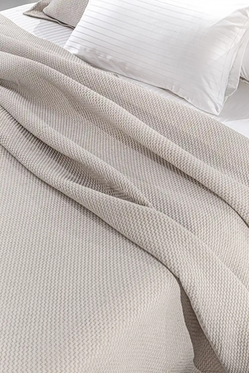 Ανοιξιάτικη κουβέρτα ημίδιπλη, κατάλληλη για ελαφρύ σκέπασμα ή για κάλυμμα του κρεβατιού. Mπεζ, 180 x 260 εκατοστά.