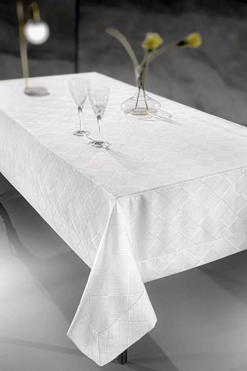 Ένα διαχρονικό τραπεζομάντηλο με jacquard πλέξη και απαλή υφή, σε ουδέτερους χρωματικούς τόνους το οποίο μπορεί να ταιριάξει σε όλες τις τραπεζαρίες.
